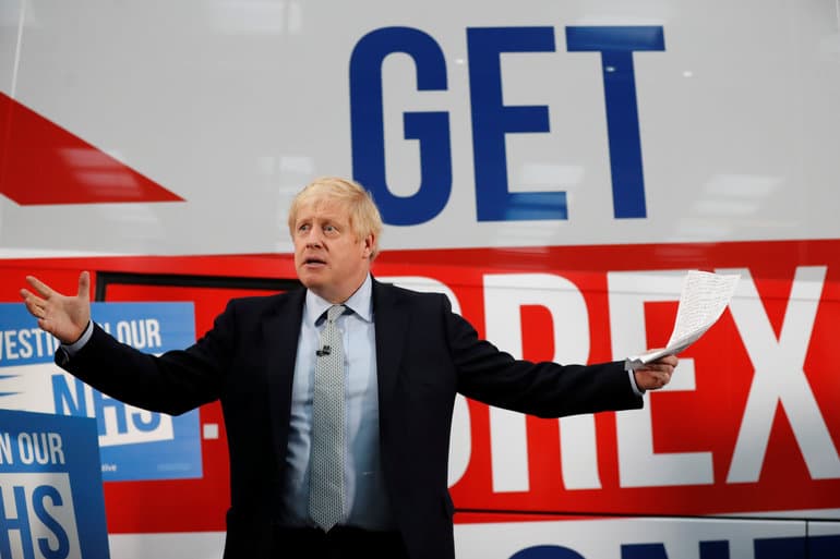 Boris Johnson foran en kampagnebus i 2019 i Manchester. Han var premierminister dengang og gik til valg på at få realiseret Storbritanniens farvel til EU. Det formelle farvel kom den 31. januar 2020. Det er ikke gået, som Boris Johnson sagde til sine vælgere. (Arkivfoto). - Foto: Pool/Reuters